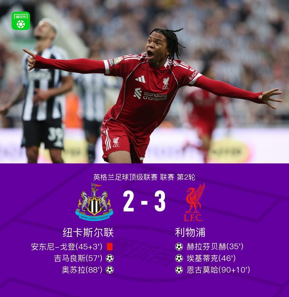 8月26日,英格兰足球顶级联赛第2轮,纽卡斯尔联坐镇主场迎战利物浦。 比赛第35分钟,加克波送出助攻,赫拉芬贝赫为利物浦首开纪录。上半场补时第3分钟,安东尼-戈登因犯规被红牌罚下,纽卡斯尔联在人数上陷入劣势。 易边再战,第46分钟,加克波再次送出助攻,埃基蒂克推射破门,利物浦扩大领先优势。第57分钟,利夫拉门托传中助攻吉马良斯头球破门,纽卡斯尔联扳回一城。第88分钟,奥苏拉禁区外远射得手,帮助纽卡斯尔联将比分追至2-3。 下半场补时第10分钟,萨拉赫助攻恩古莫哈破门,利物浦将比分最终锁定为3-2。 全场比赛结束,利物浦客场3-2战胜纽卡斯尔联。