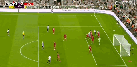 第57分钟,扳回一城!吉马良斯力压凯尔凯兹头球破门,纽卡1-2利物浦